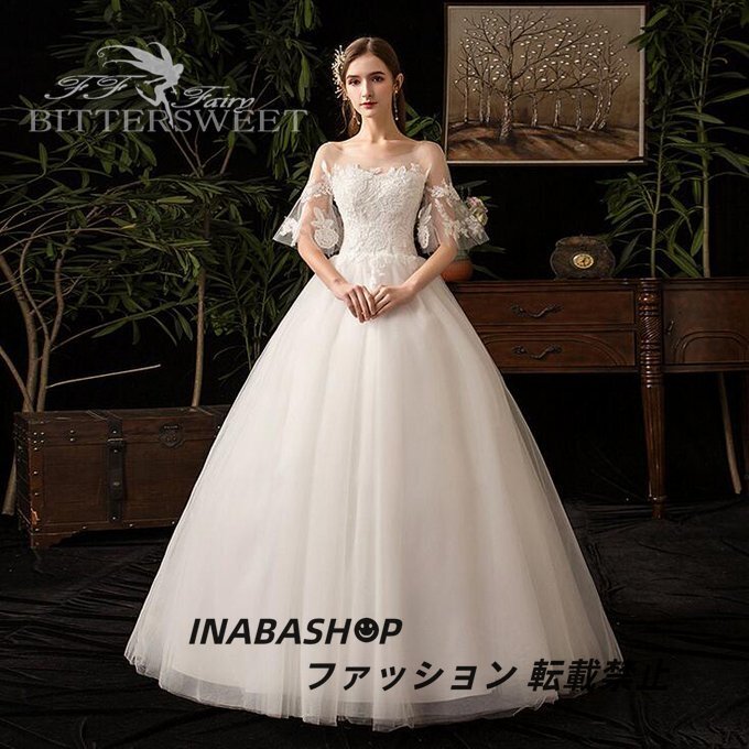 - ウェディングドレス ウエディングドレス フレア袖 床付きタイプ Aライン ロング 前撮り 後撮り 披露宴結婚式 演奏会 発表会 海外挙式ドレス