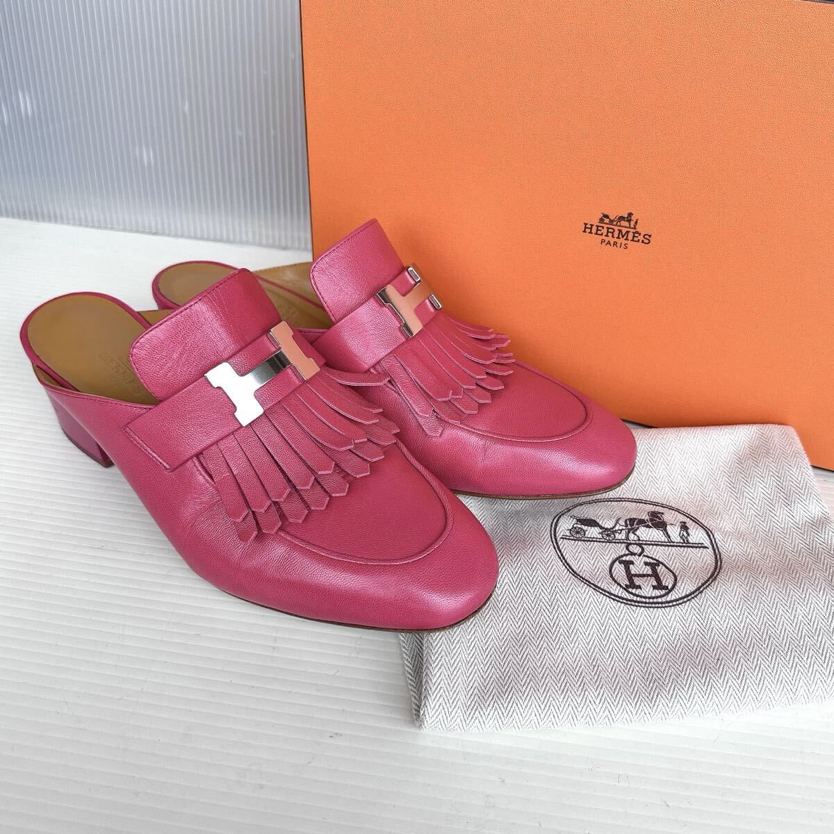 > HERMES エルメス リヴォリ コンスタンス フリンジ付き H金具 ミュール ローファー 革靴 パンプス レーディス フラットシューズ 靴 37.5