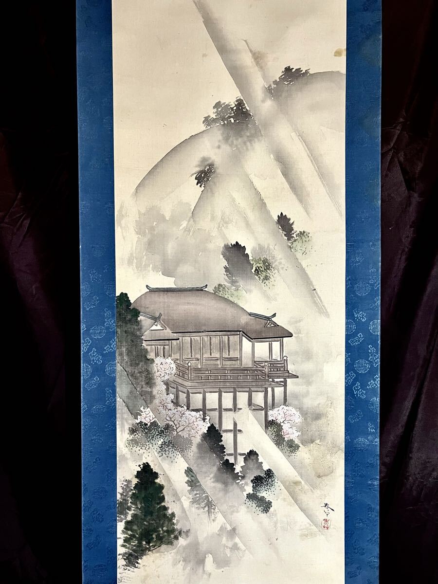 【模写】【仙】菱田春草「清水寺桜光芒図」絹本 合箱 春景 風景画 山水図 絵画 掛軸 明治時代の日本画家 長野の人 師: 岡倉天心 橋本雅邦