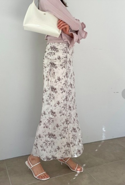 > ★夏秋デート完売大人気【SNIDELスナイデル】サイドギャザーナロースカート★上品ベージュ花柄★旅行オフィス初秋の後楽通勤通学★