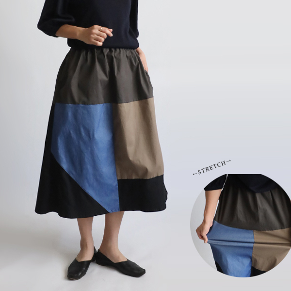 - 送料無料 愉快なスカートまつり 77cm丈 ストレッチチノ パッチワーク スカート ギャザー スカート コットン Y53B