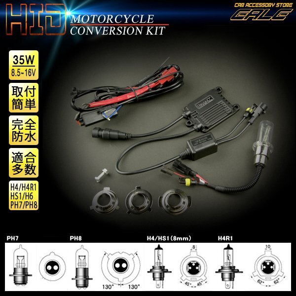 > バイク用HIDキット 色温度10000K 35W 薄型バラスト T19(PH7)・T14.7(PH8)・H4・HS1・H4R1・H6 対応アダプターセット 1灯分 G-94