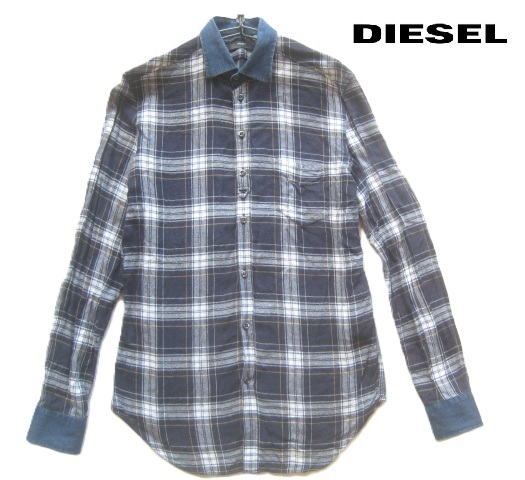 > 高級トルコ製!!ディーゼル DIESEL*金属ロゴプレート付き デニム襟 チェック柄レーヨンシャツ S 白×濃灰×ベージュ