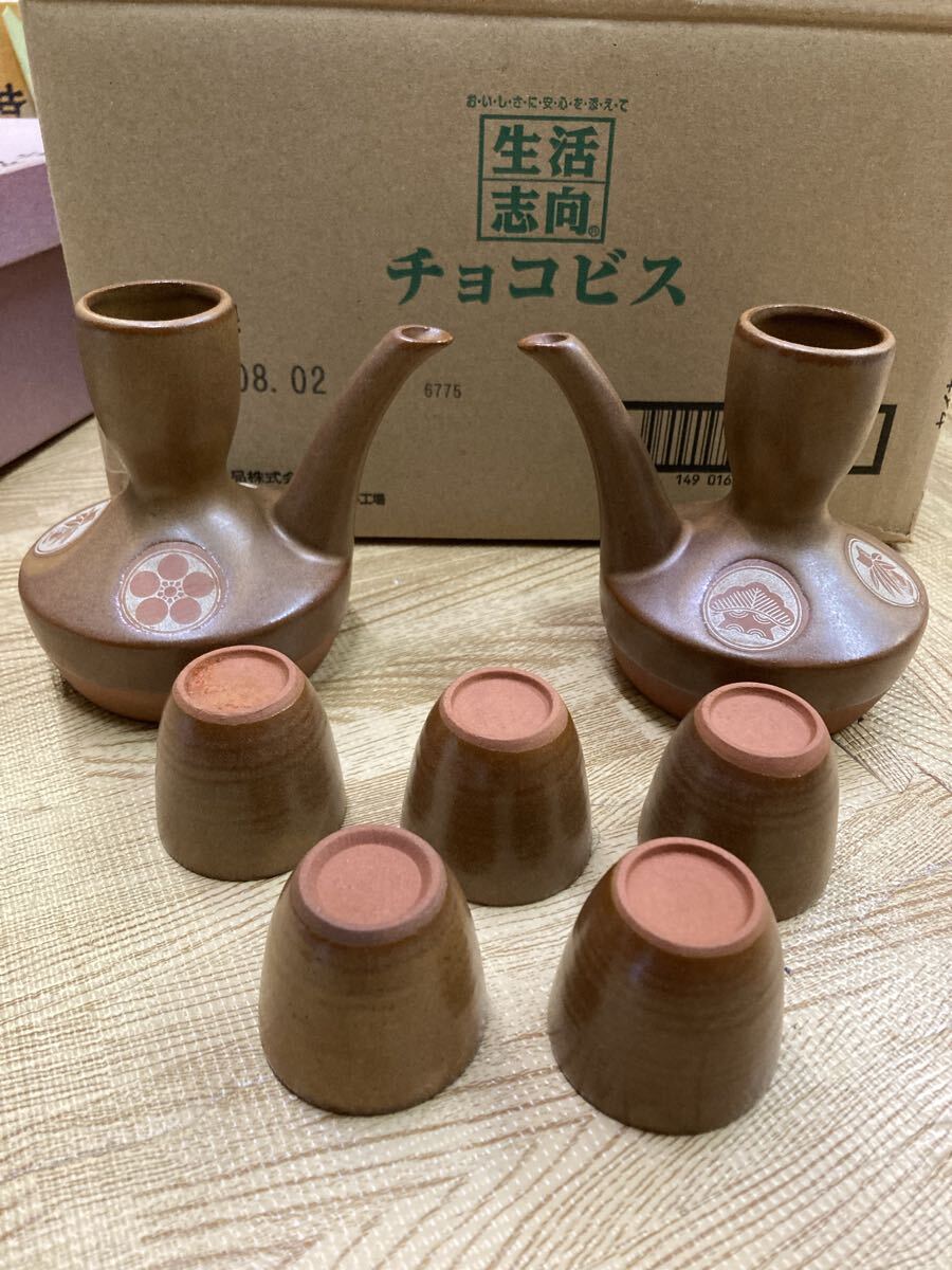 - A1-134 朱土焼 玉風謹製 御酒器 徳利と盃セット酒器 酒燗器