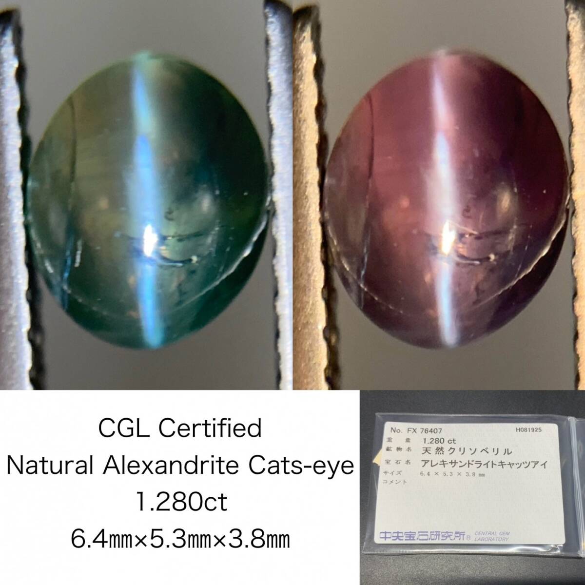 - アレキサンドライトキャッツアイ 天然 1.280ct 中央宝石ソーティング付き 6.4×5.3×3.8 ルース( 裸石 ) 6456Y