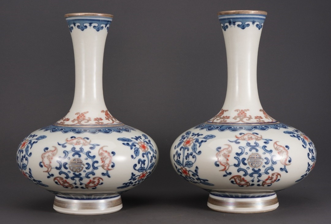 - 珍品旧蔵 清時代 大清康熙年製 青と白の釉薬に赤い五福の絵を描いた銀瓶のペア 時代物 唐物 陶磁器 陶芸 中国美術 古賞物 古物保証 lz8.26