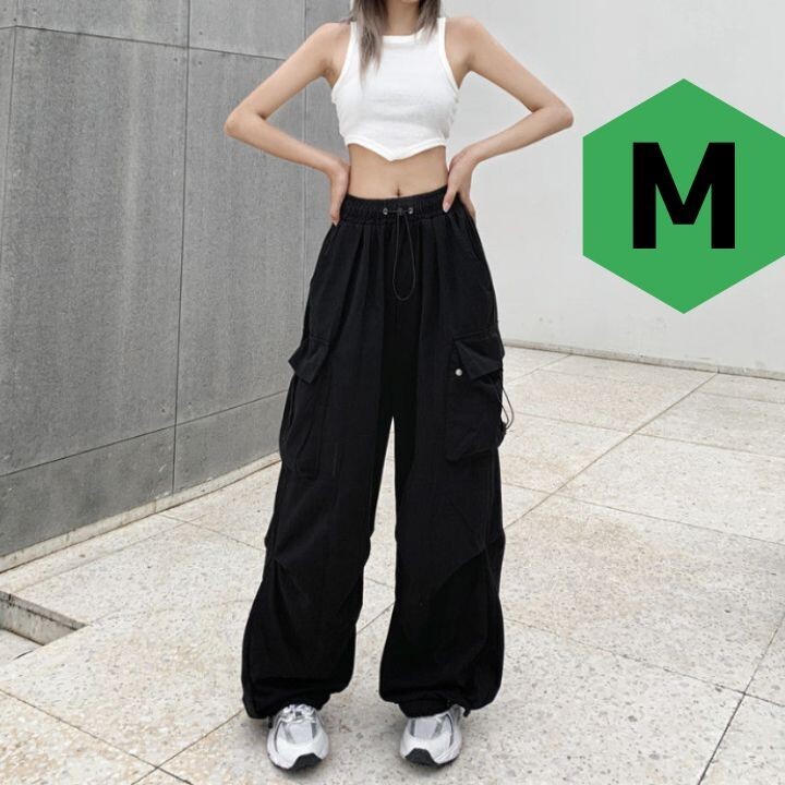 - レディース カーゴパンツ M 大きいサイズ ワイド 作業着 カジュアル 黒