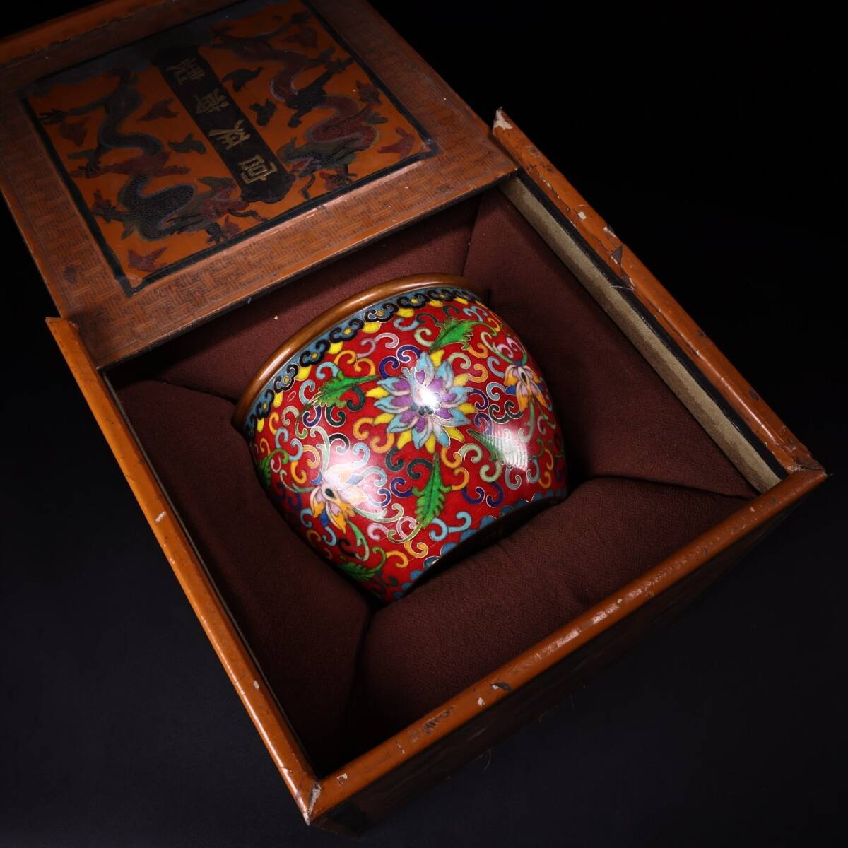 - 『館蔵珍品 銅製 景泰藍 琺瑯彩 花卉紋 聚寶缸 箱付 置物 賞物』稀少珍蔵品 古賞物 貴重物品 収蔵品 中国古美術 時代物 古董品