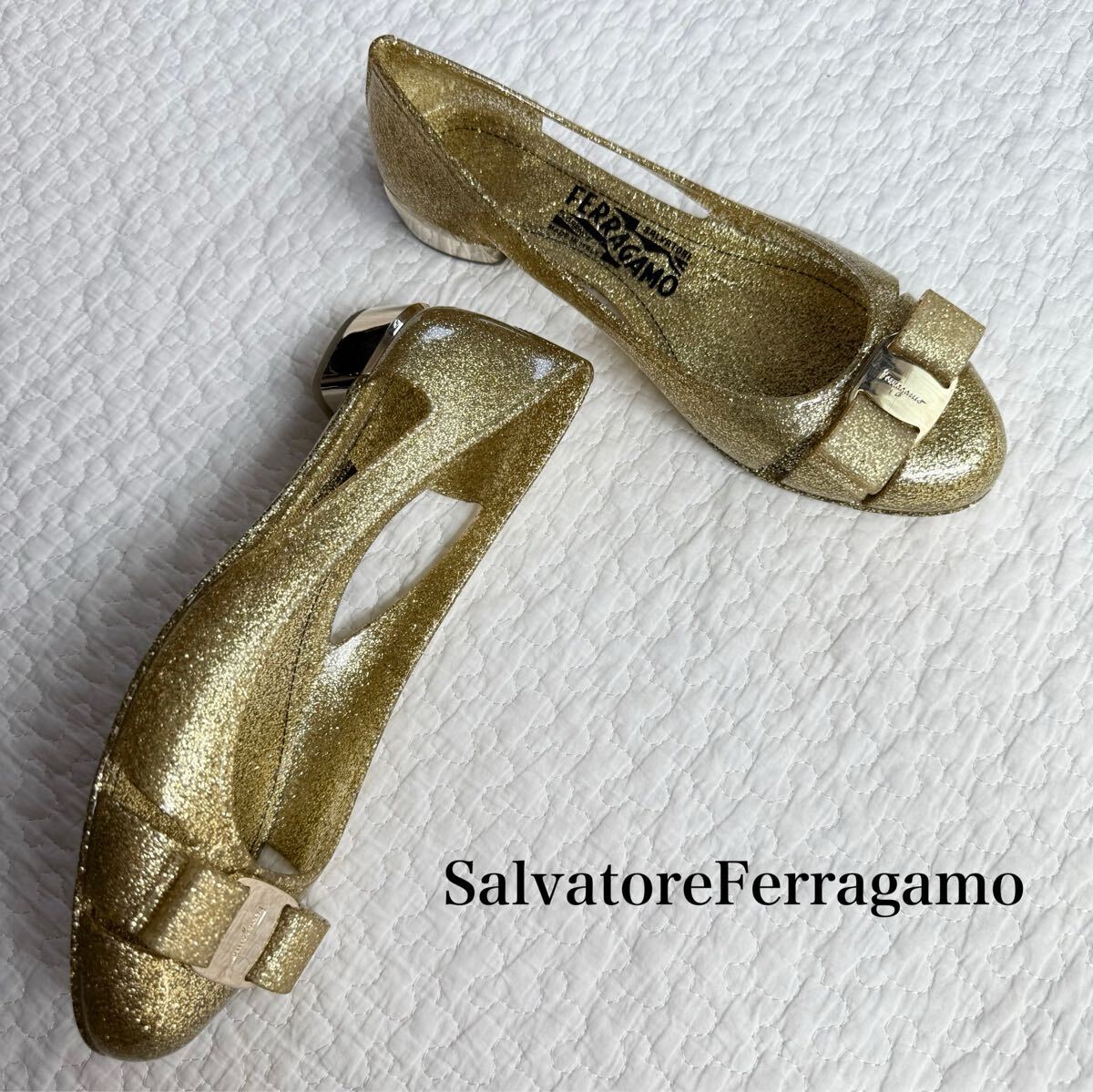 - 極美品 Salvatore Ferragamo サルヴァトーレフェラガモ Vara Jelly ヴァラリボン ラバーパンプス 6 23.5cm ラメ ゴールド