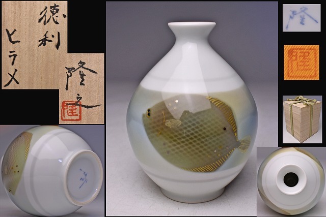 > 藤井隆之 ★ ヒラメ 徳利 ★ 共箱 共布 ★ 酒器 ★ 東京芸大 ★ 淡い色彩 ★ 可愛らしい平目が描かれた逸品 ★ 丸みのある小ぶりの徳利 ★