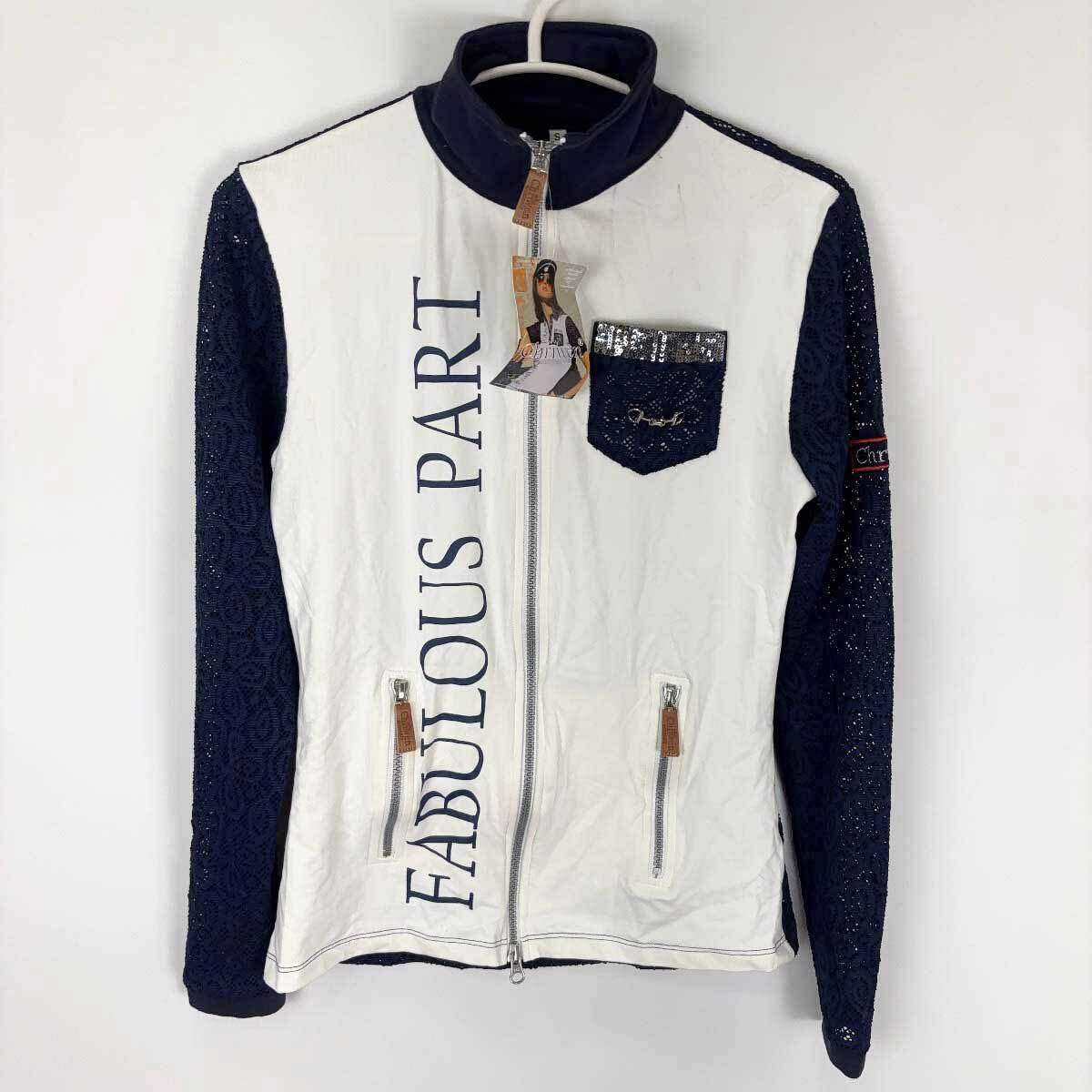 > 【中古】Chriwen クリューベン ジップアップ ロングスリーブ 刺繍 ストレッチ スパンコール S ネイビー ホワイト レディース 乗馬 馬術