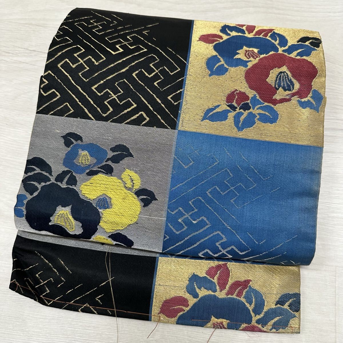 > アンティーク 名古屋帯 市松に椿の織出し 九寸 正絹 着物 W-3891