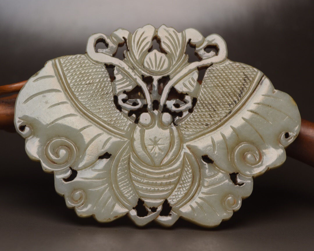 - ▽鴻▽ 和田玉製 細密彫 蝴蝶 置物 賞物 古賞物 古董品 時代物 稀少珍品 中国古玩 中国古美術