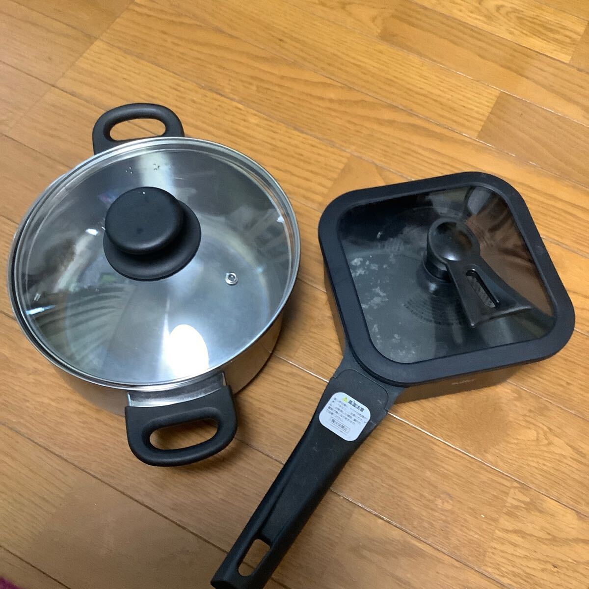 > 両手鍋鉄サイズ約20、5×9、5cm ガラス蓋付きとSutto 四角 フライパン 底鉄 サイズ約内径18cm 用 ガラス蓋 付き17×8cm 2個セット中古品