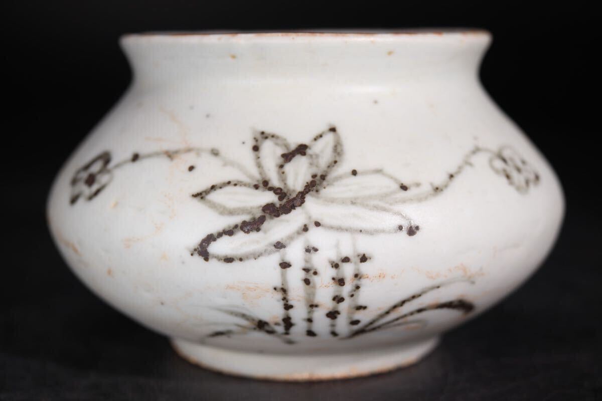 - 時代 白磁 鉄絵 草花文 小壺 / 朝鮮古美術 李朝 建水 茶器 煎茶道具 検索: 鶏龍山 .G2411