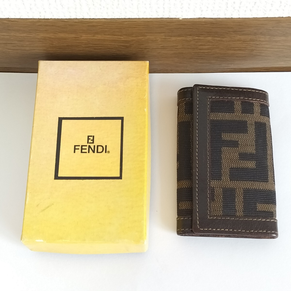 - 【フェンディ】本物 FENDI キーケース ズッカ柄 F柄 6連フック ダークブラウン色系 レザー×キャンバス メンズ レディース イタリア製 箱付