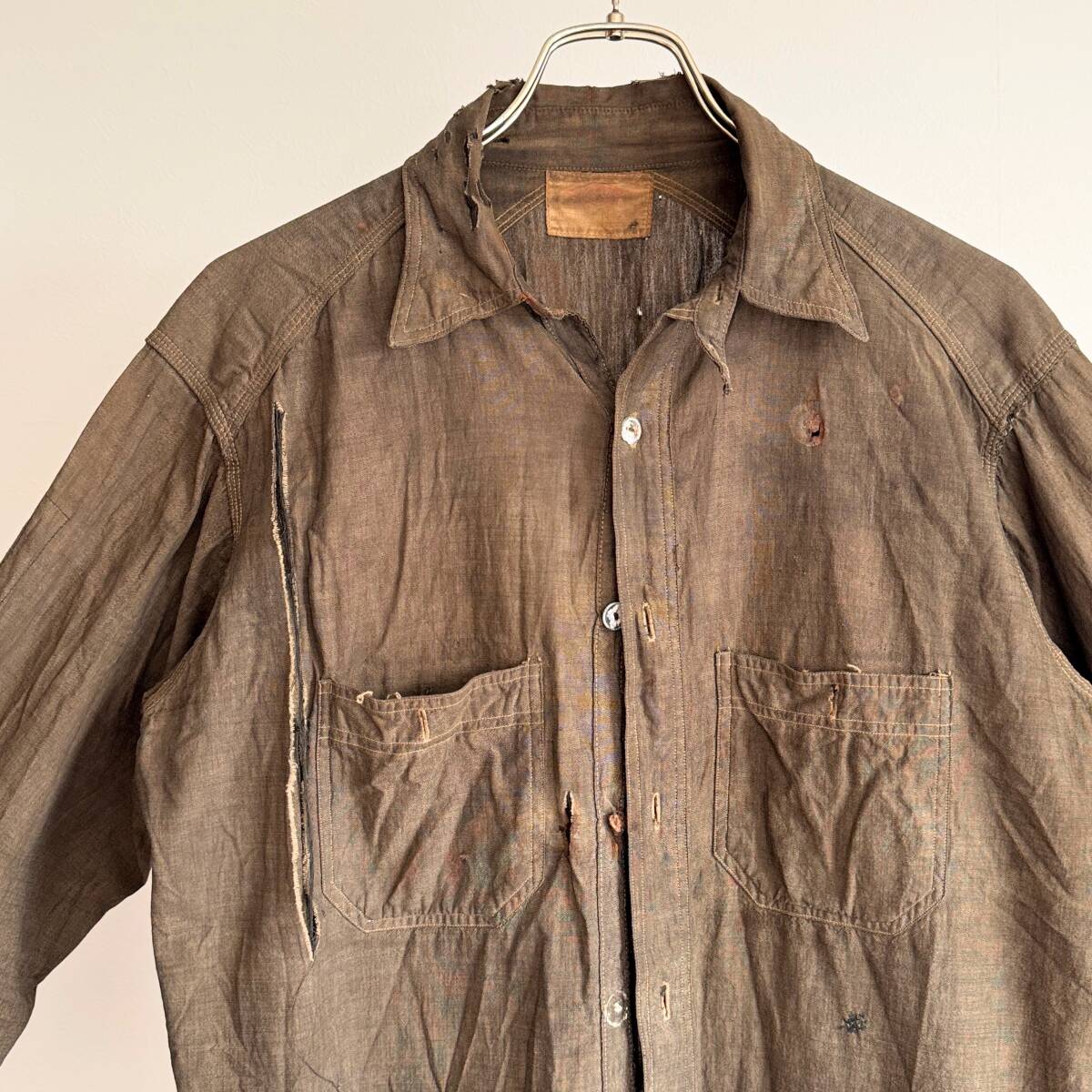 > 希少 《 Rare / Boro 》 10s 20s【 1910s 1920s ボロ チンスト ワークシャツ ブラウン シャンブレー ビンテージ メタルボタン 】