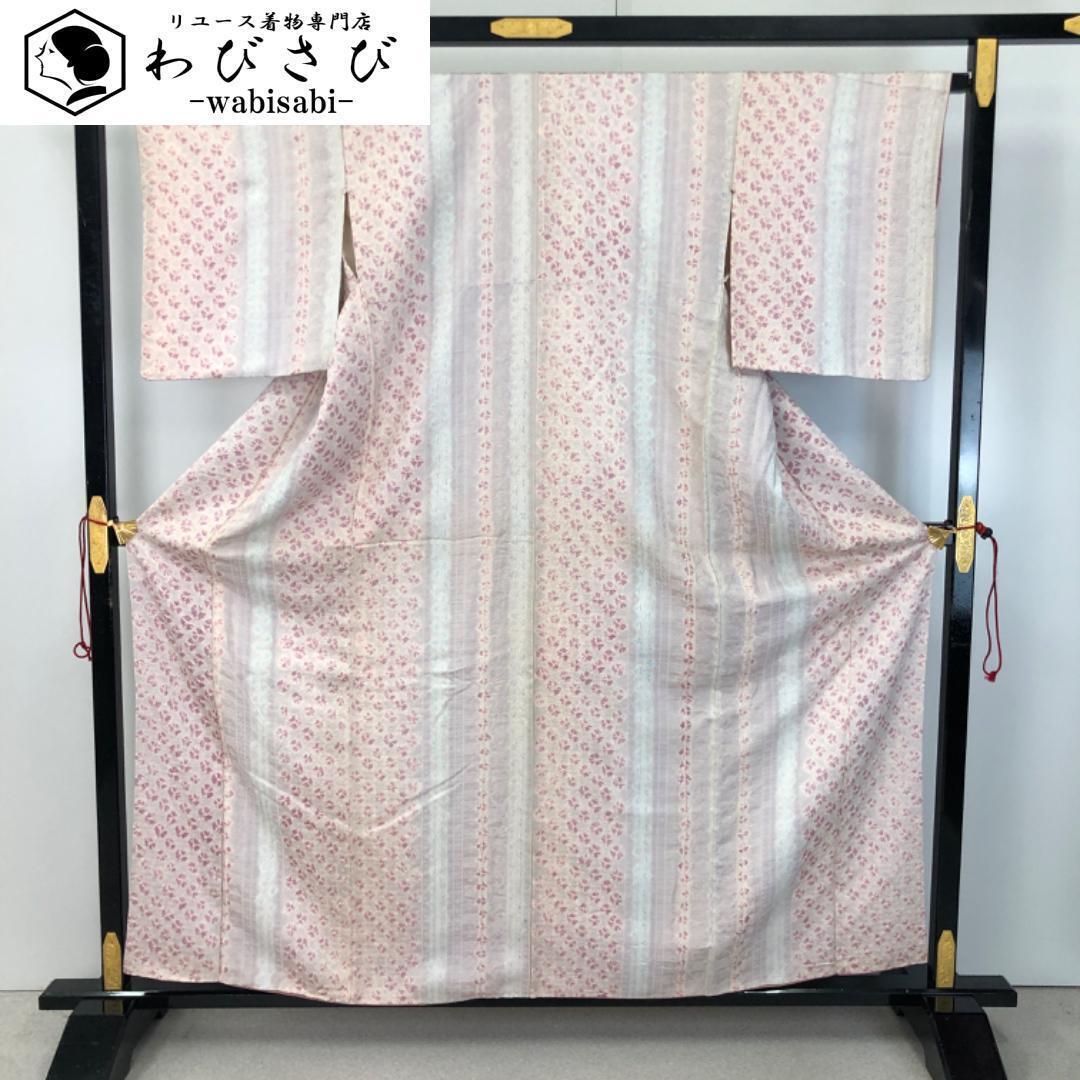 > 小紋 蜘蛛絞り 縦縞模様 梅紫鼠色 K-5120 着物 きもの kimono 和服 和装 中古 リサイクル着物 【送料無料】
