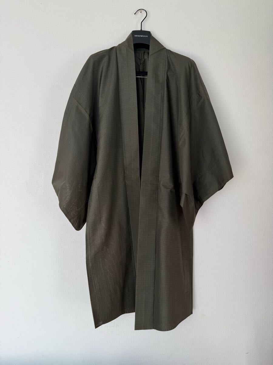 - 羽織 男性用 和装コート カーキ 緑 無地 シンプル アンティーク 着物 羽織紐不要 時代和装 レトロ モダン 紳士着物 茶道 稽古 普段着 古布