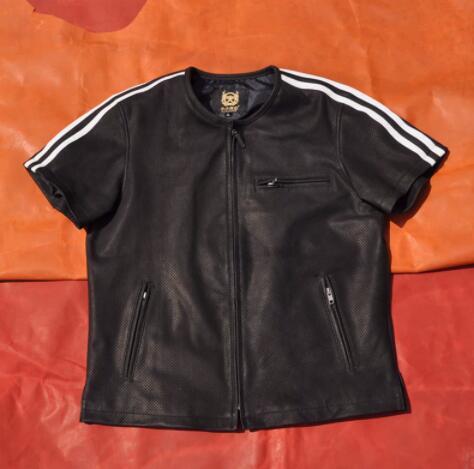 - 新入荷サイズL かっこいい 本革 シープスキン S/S パンチングレザー ジップジャケット 黒 メンズ バイカー ライダース 羊革