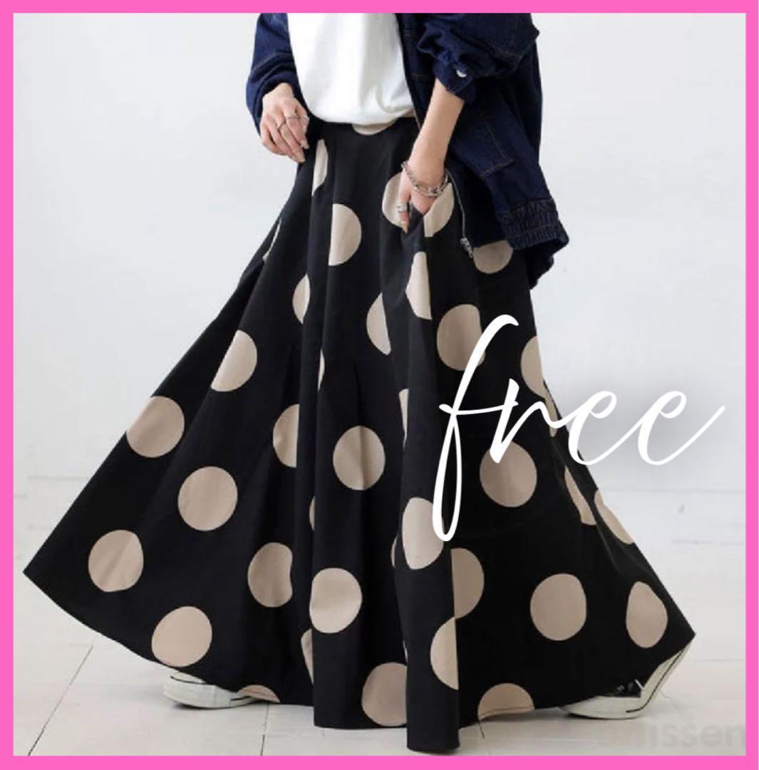 - ロングスカート フレアスカート フリーサイズ ウエストゴム 水玉 ブラック ドット 体型カバー
