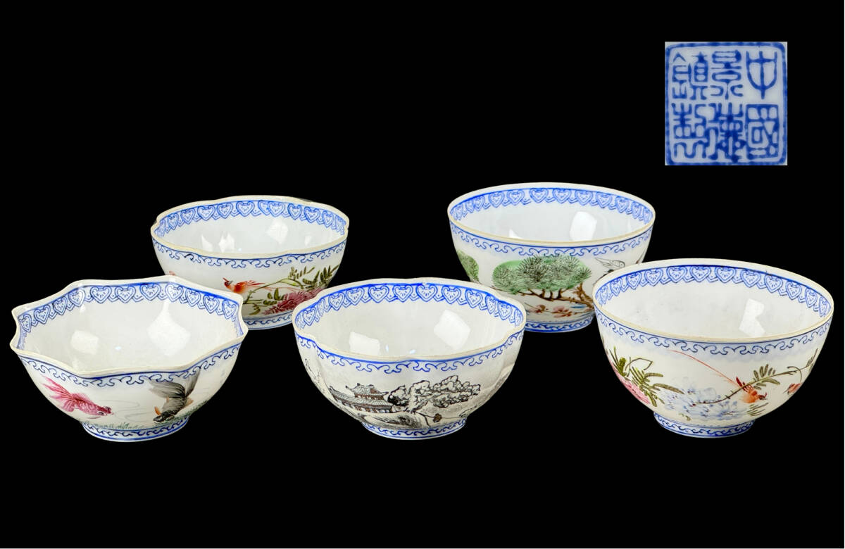 - 【偲】景徳鎮 色絵磁器 薄胎茶碗 茶碗 五客 中国美術 煎茶碗 茶道具 c-189
