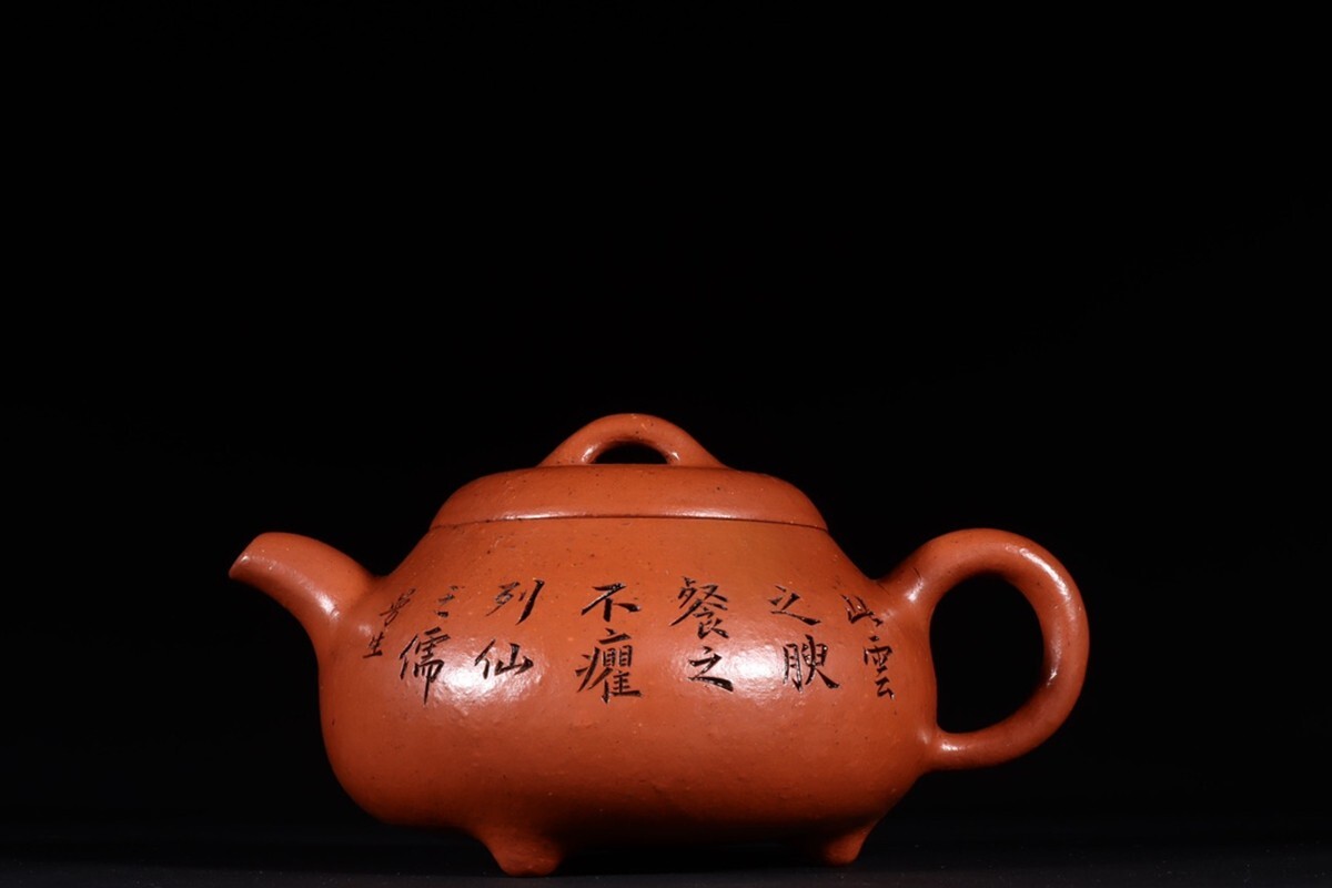 - 「紫砂彫 朱泥詩文納瓢紫砂茶壺 阿曼陀室銘 清時代」陶磁器 急須 茶道具 古賞物 中国古美術 旧蔵出