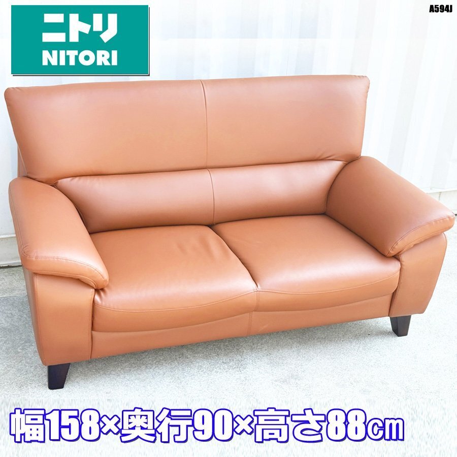 - 美品! ニトリ 合成皮 ゆったり2人掛け 幅158cm ブラウン 木製脚 ◇A594J