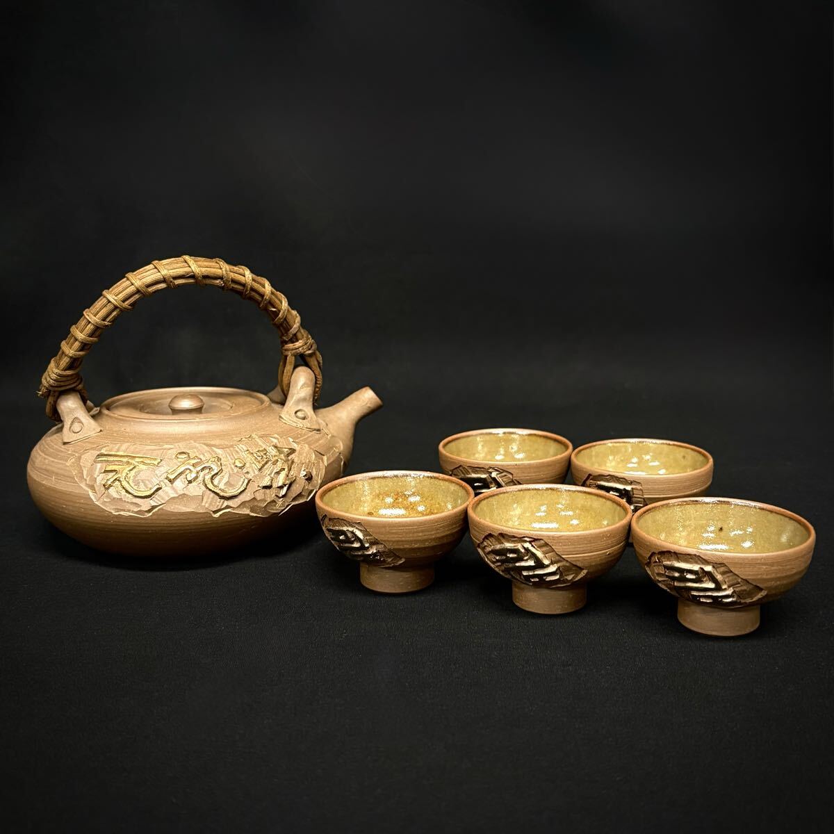 - 天龍峡焼 金彩龍文 篆刻 煎茶器揃 急須 煎茶碗5客 砲口 藤編提手 煎茶器 煎茶道具 天竜峡焼 時代物 美品 (09017Y