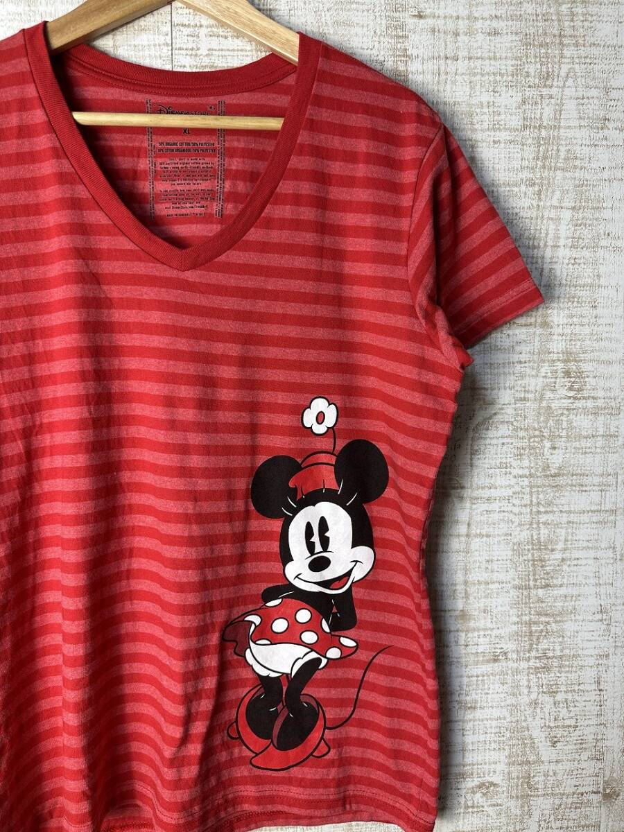 - ☆US古着【XL】ビッグサイズ Disney ディズニー ミニー Tシャツ キャラクター プリント ボーダー 柄 Vネック コットンポリ ◆5107◆