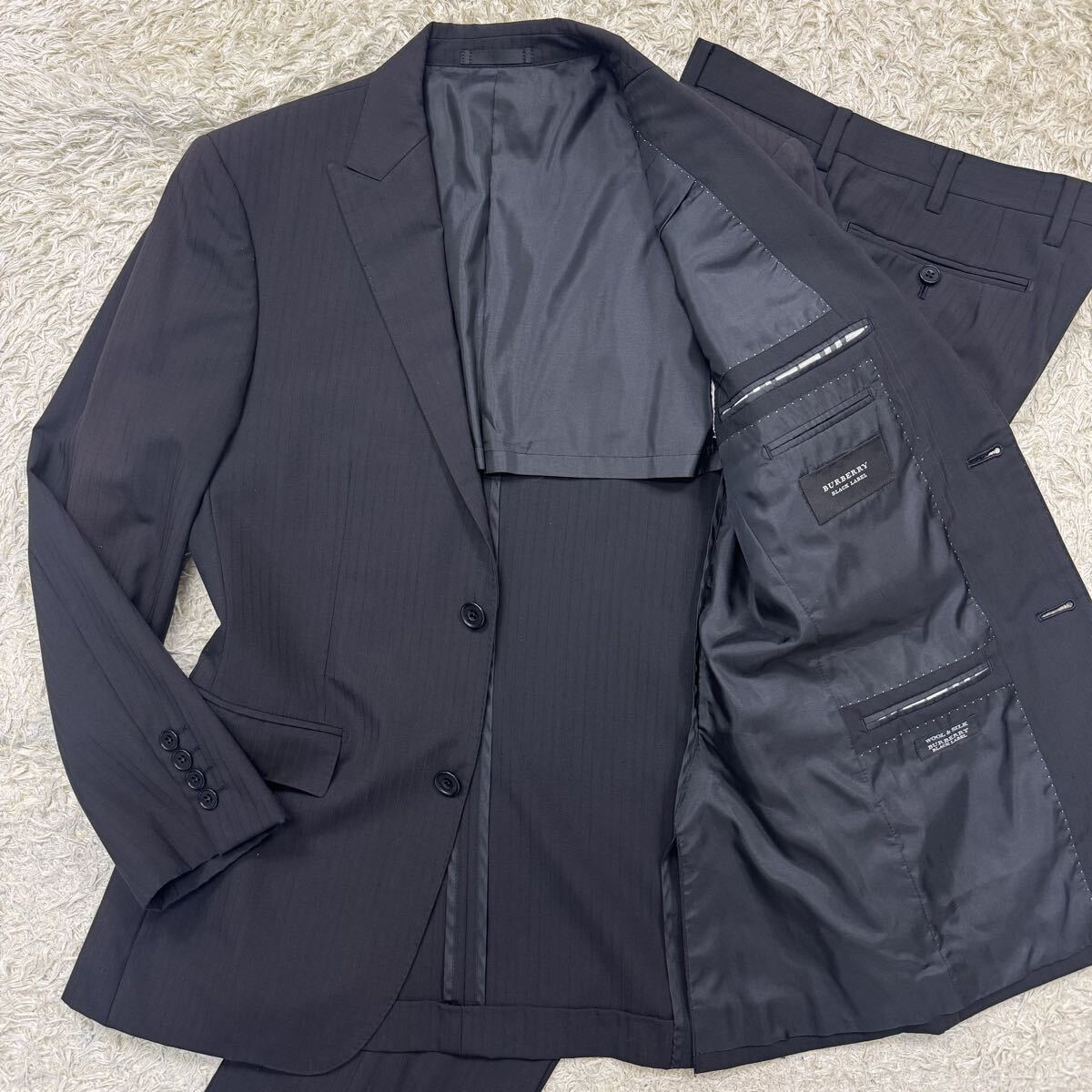 > 美品◎バーバリーブラックレーベル BURBERRY BLACK LABEL スーツ セットアップ シルク混 ビジネス ストライプ ノバチェック ブラック 黒 S