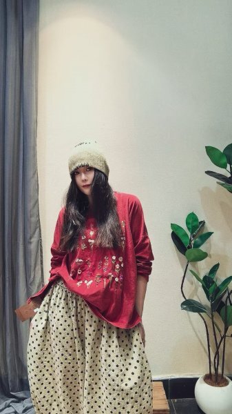 - gl 2509 Tシャツ チュニック トップス 綿&麻 洋服ミックス アンティーク風 ロマンファッション 刺花柄 レッド