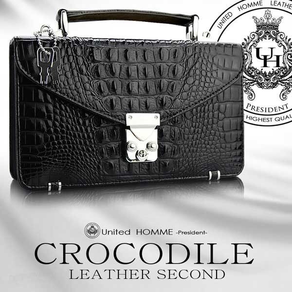 - 【unitedHOMME】クロコダイル型押し牛革セカンドバッグ■ブラック×1個