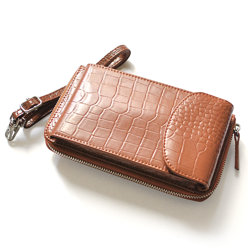 - 牛革クロコ型押し財布機能付きスマートフォンポーチ No.3170■レディースカラバリ牛革ポーチ キャメル×1個