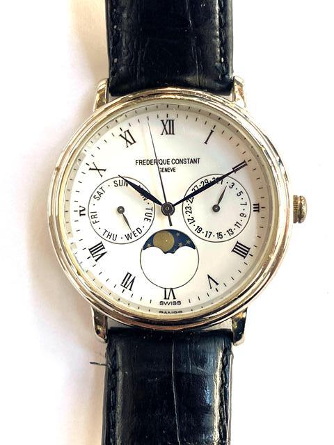 - 【即決/稼働/訳アリ】 FREDERIQUE CONSTANT フレデリック コンスタント ムーンフェイズ クオーツ SS ステンレス 革 デイデイト 電池式