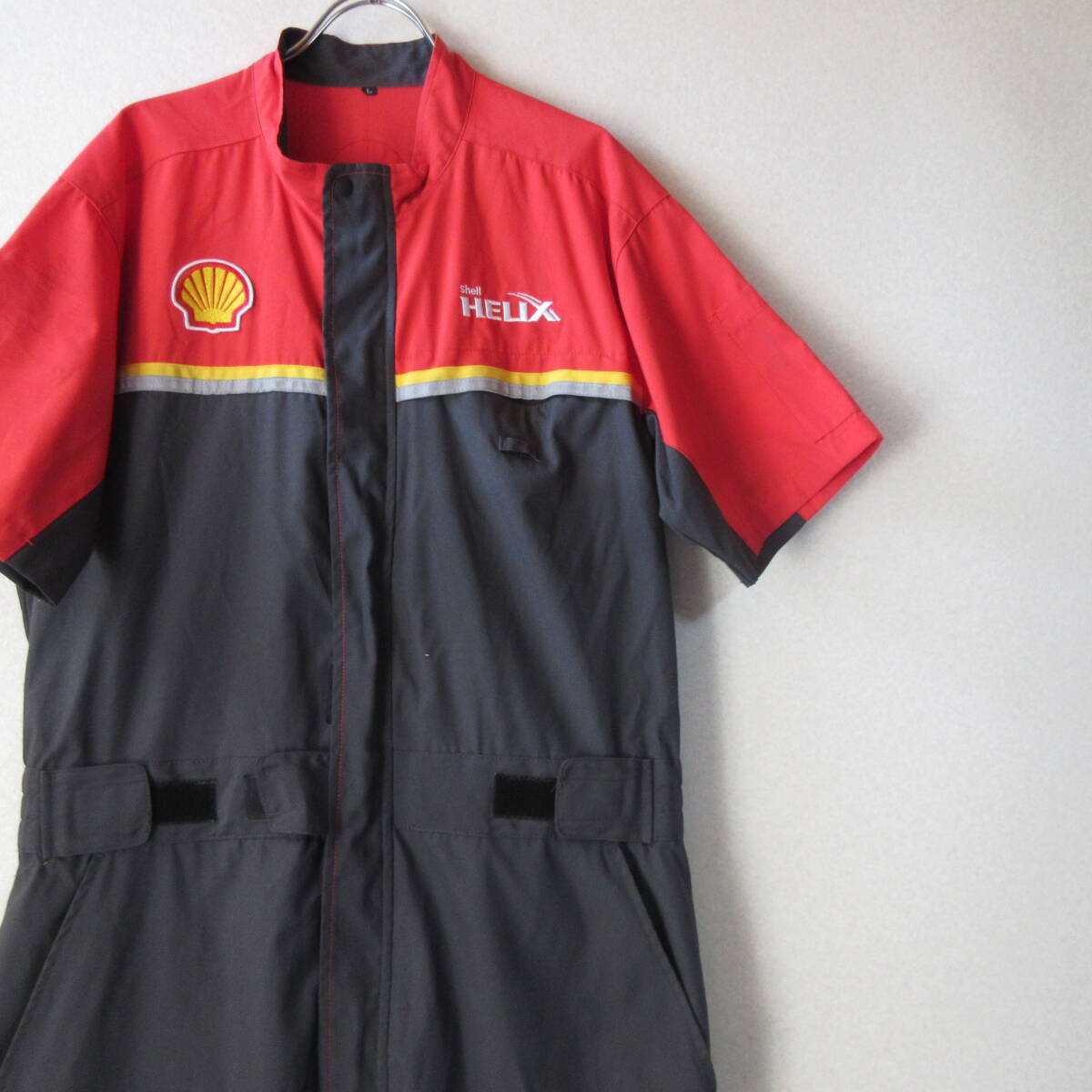 > 〇良品 使用少 昭和シェル◆作業服 つなぎ メカニック オーバーオール 夏用 半袖 自動車 フェラーリロゴ◆メンズ グレー/レッド Lサイズ