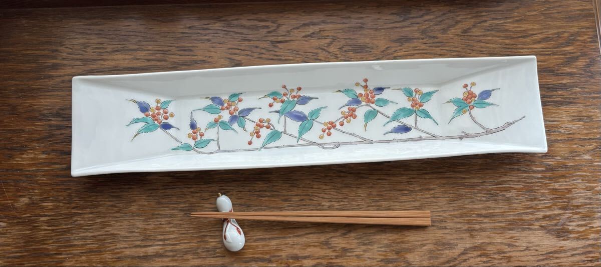 - 長皿 長角皿 45cm 前菜皿 アミューズ オードブル皿 南天の図柄 自宅保管品 美品 色絵