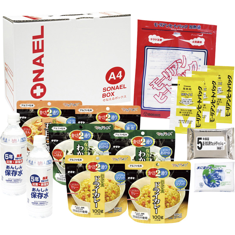 〇注意事項・送料800円が販売価格に含まれています・お取り寄せ商品です。弊社にて手配後、メーカー・卸業者からの直送になります。・まれにメーカー欠品、出荷遅延等が発生致します。問題発生時は別途メールにてご連絡致します。・配送方法の指定、日時指定、置き配、ギフト対応、他商品との同梱配送などは対応できません。・まとめ買いや複数購入の場合は通常より発送に時間が掛かる場合がございます・複数個口の場合、2階以上への搬入ができない場合があります。(その場合は1階での受け渡しとなります)・大型連休、お盆、年末年始などは発送をお休みさせていただく場合がございます・メーカー都合により、パッケージは予告なく変更される場合がございます・梱包用のダンボールはリサイクル品を使用させていただきます。・注文に関するご連絡(注文確定通知・発送通知など)はメールでご案内させていただきます※商品ページの内容について、少しでもご不明な点などがございましたら購入前に一度ご連絡ください〇商品説明あらゆるギフトシーンにおすすめです!食品中心の在宅避難セット。A4サイズのファイルボックスタイプでクローゼットや棚などに効率よく収納できます。〇商品仕様●内容:わかめごはん・五目ごはん・ドライカレー・保存水500mL(5年保存)×各2、発熱剤×3、ウェットティッシュ・水に流せるペーパー・加熱袋×各1規格●化粧箱入(300×245×150mm) 2200g●加工地:日本●賞味期限:製造日より常温にて1825日(出典:株式会社 八大)