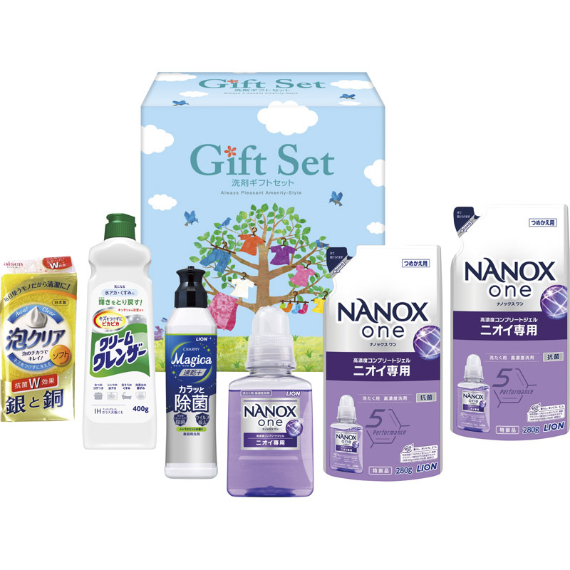 〇注意事項・送料800円が販売価格に含まれています・お取り寄せ商品です。弊社にて手配後、メーカー・卸業者からの直送になります。・まれにメーカー欠品、出荷遅延等が発生致します。問題発生時は別途メールにてご連絡致します。・配送方法の指定、日時指定、置き配、ギフト対応、他商品との同梱配送などは対応できません。・まとめ買いや複数購入の場合は通常より発送に時間が掛かる場合がございます・複数個口の場合、2階以上への搬入ができない場合があります。(その場合は1階での受け渡しとなります)・大型連休、お盆、年末年始などは発送をお休みさせていただく場合がございます・メーカー都合により、パッケージは予告なく変更される場合がございます・梱包用のダンボールはリサイクル品を使用させていただきます。・注文に関するご連絡(注文確定通知・発送通知など)はメールでご案内させていただきます※商品ページの内容について、少しでもご不明な点などがございましたら購入前に一度ご連絡ください〇商品説明あらゆるギフトシーンにおすすめです!最高難度の汚れまで落とすライオンナノックスワンを主体とした超コンパクト液体洗剤ギフト。〇商品仕様●内容:ライオンナノックスワン:380g×1、詰替:280g×2、ライオンチャーミーマジカ速乾プラス:220mL・クリームクレンザー:400g・泡クリアスポンジ×各1規格●化粧箱入(190×245×96mm) 1880g●加工地:日本(出典:株式会社 八大)