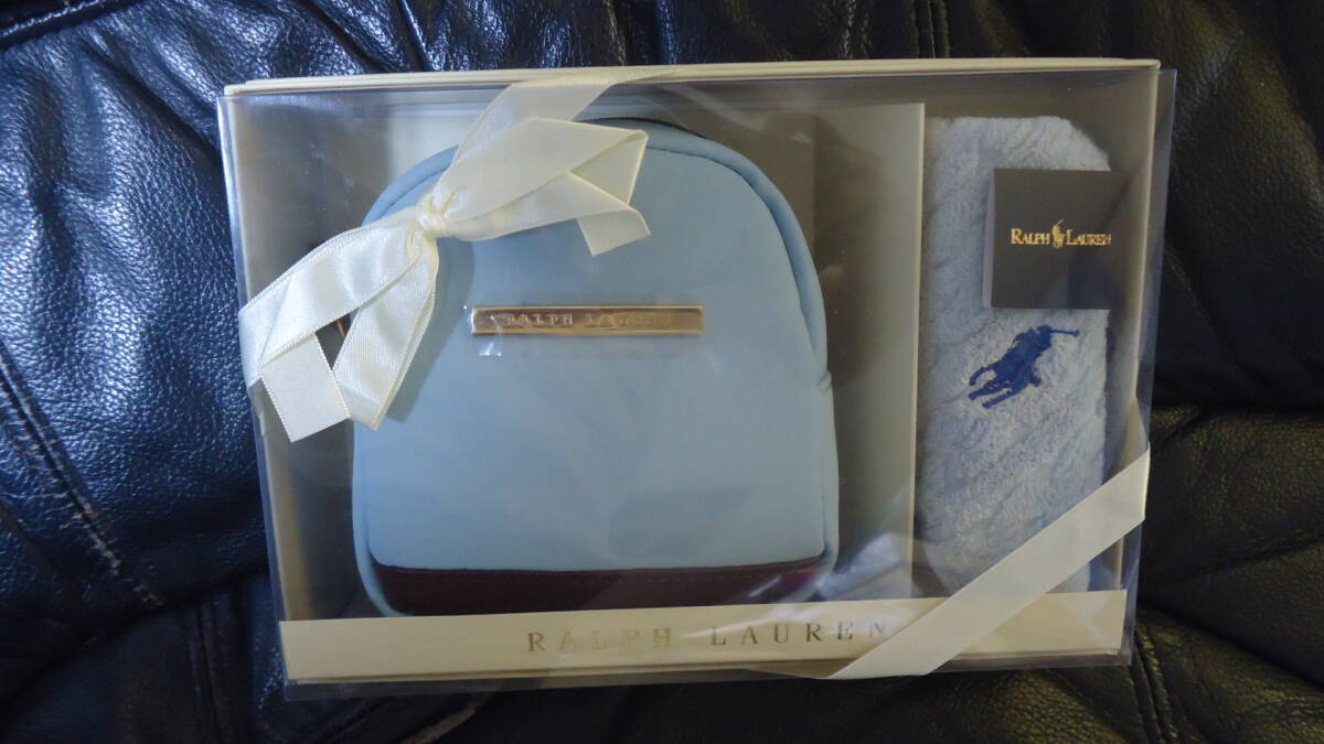 > ★即決★ ラルフローレン RALPH LAUREN ポーチ&タオルハンカチ 化粧ポーチ 水色系 小物入れ 未使用