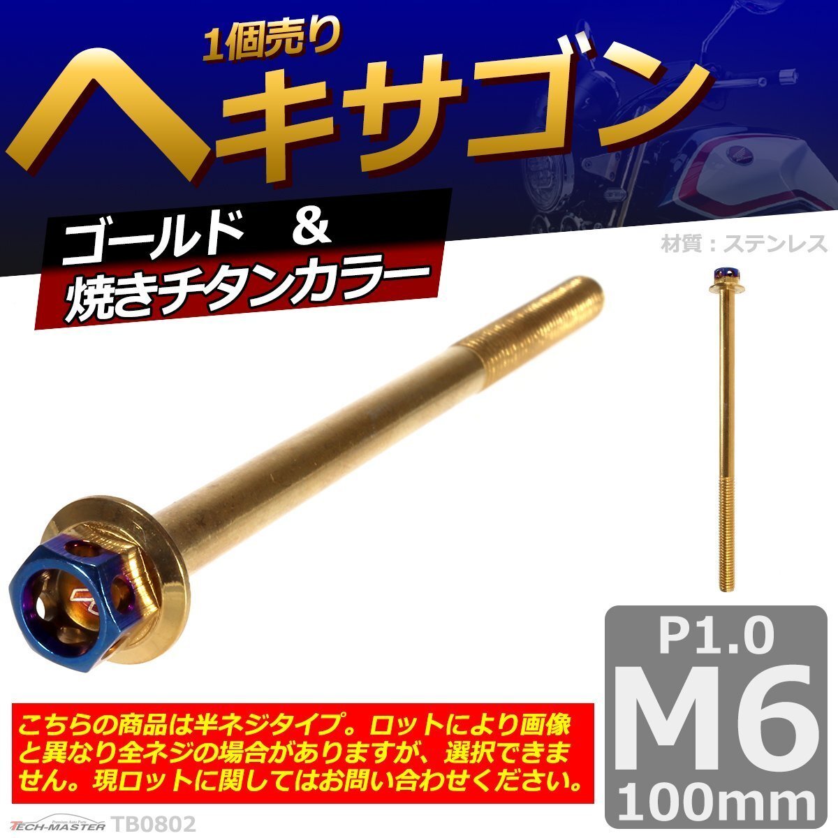 > M6×100mm P1.0 ヘキサゴン 六角ボルト ステンレス 車/バイク/自転車 ドレスアップ パーツ ゴールド&焼きチタンカラー 1個 TB0802
