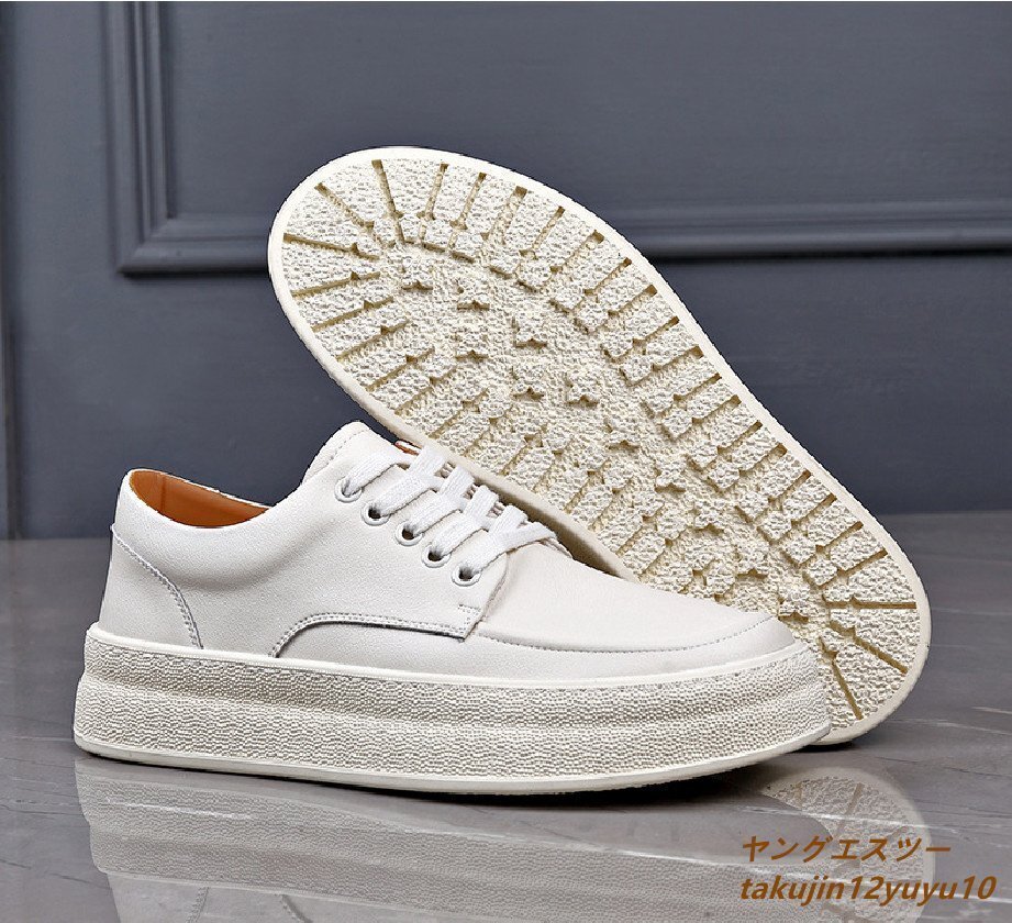 > 新品セール◆スニーカー メンズ 牛革 滑り止め 厚底 本革レザーシューズ 身長アップ 通気性 快適 お洒落 ドライビングシューズ 白系 26.0cm