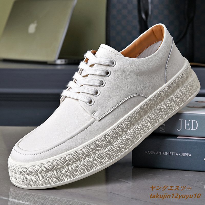 - 新品セール◆スニーカー メンズ 牛革 滑り止め 厚底 本革レザーシューズ 身長アップ 通気性 快適 お洒落 ドライビングシューズ 白系 27.5cm