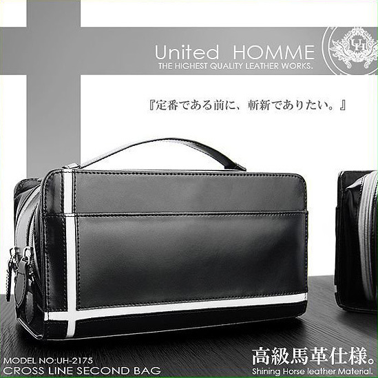 - 【unitedHOMME】馬革クロスラインセカンドバッグ■UH-2175BK■メンズポーチ本体ブラック■ホワイトライン×1個