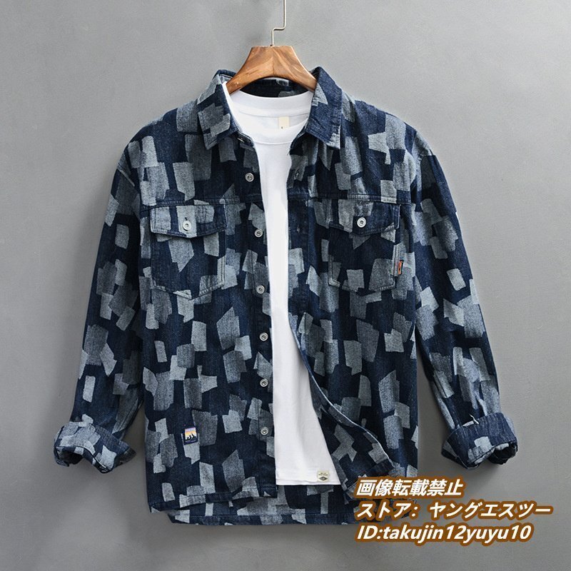 - 超希少 デニムシャツ 長袖シャツ メンズ 総柄 デニムジャケット 極美品 ヴィンテージ 個性 トレンド 春秋 カジュアルシャツ ブルー 2XL