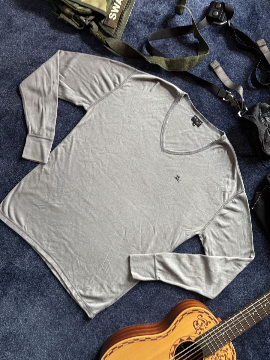 > 日本製 THE FLAT HEAD フラットヘッド R.J.Bロゴ刺繍 ワッフルサーマル素材 Vネック 袖リブ9分袖シャツ size42(XL) グレー系 MADE in JAPAN