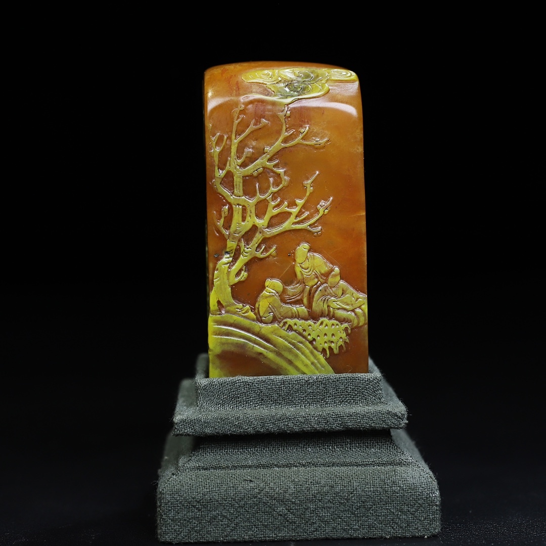 - 唐物 【清代篆刻家 趙之深】寿山石 松下聚賢 薄意印鑑 天然石 手彫 篆刻 古印材 極細工 中国古玩 骨董品 古美味 D69