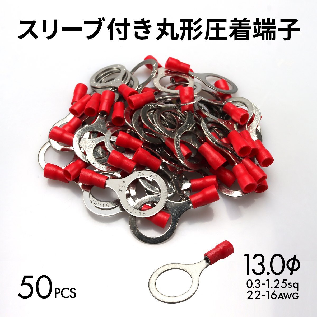 - 丸形圧着端子 スリーブ付き R型 穴径 13.0mm 22-16AWG 50個 IZ178