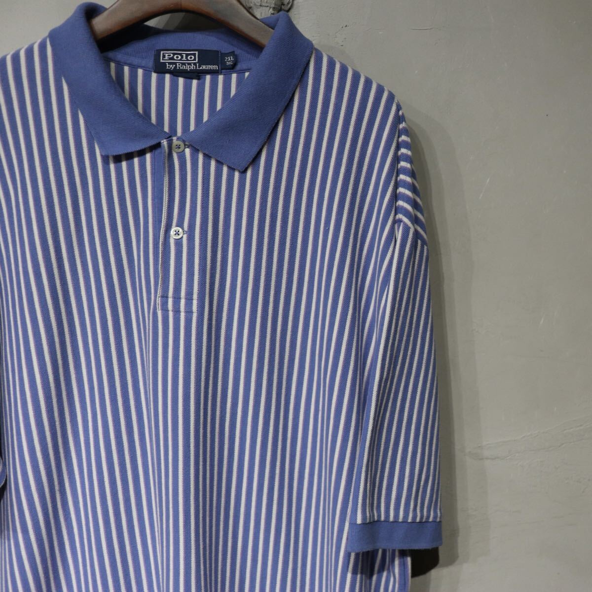 > 【即決】polo ralph lauren ポロラルフローレン ストライプ ポロシャツ 鹿の子 半袖 ポニーなし ブルー 青 ビッグサイズ 古着 2XL