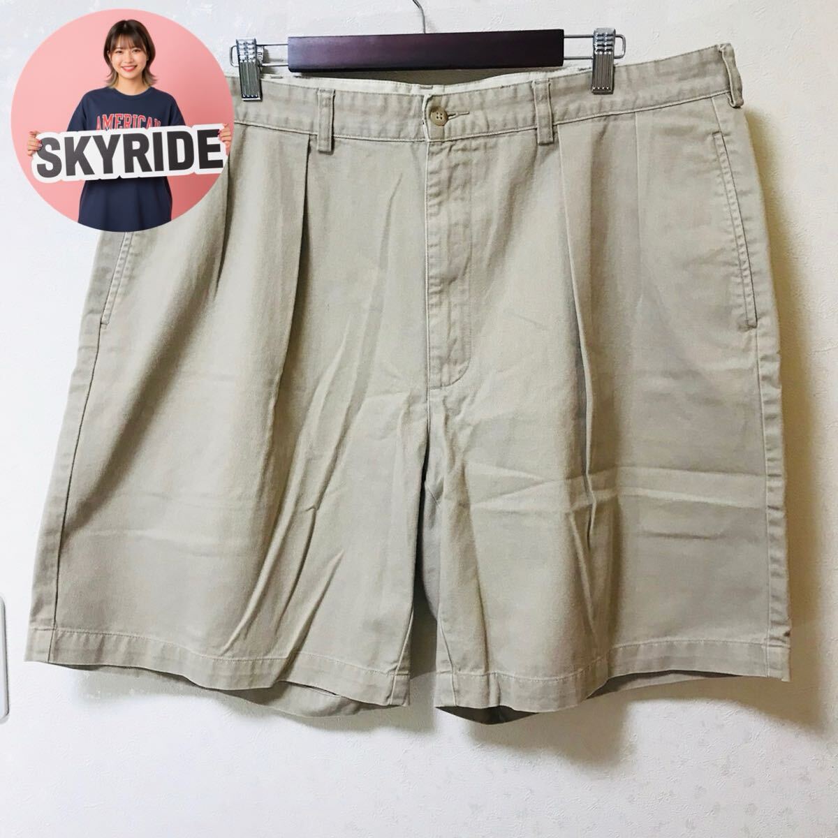 > 【人気】Polo Ralph Lauren ポロラルフローレン メンズ チノ ハーフパンツ ベージュ XL相当 プリーツ入り ゆるだぼ ショーツ 古着 #TT0293